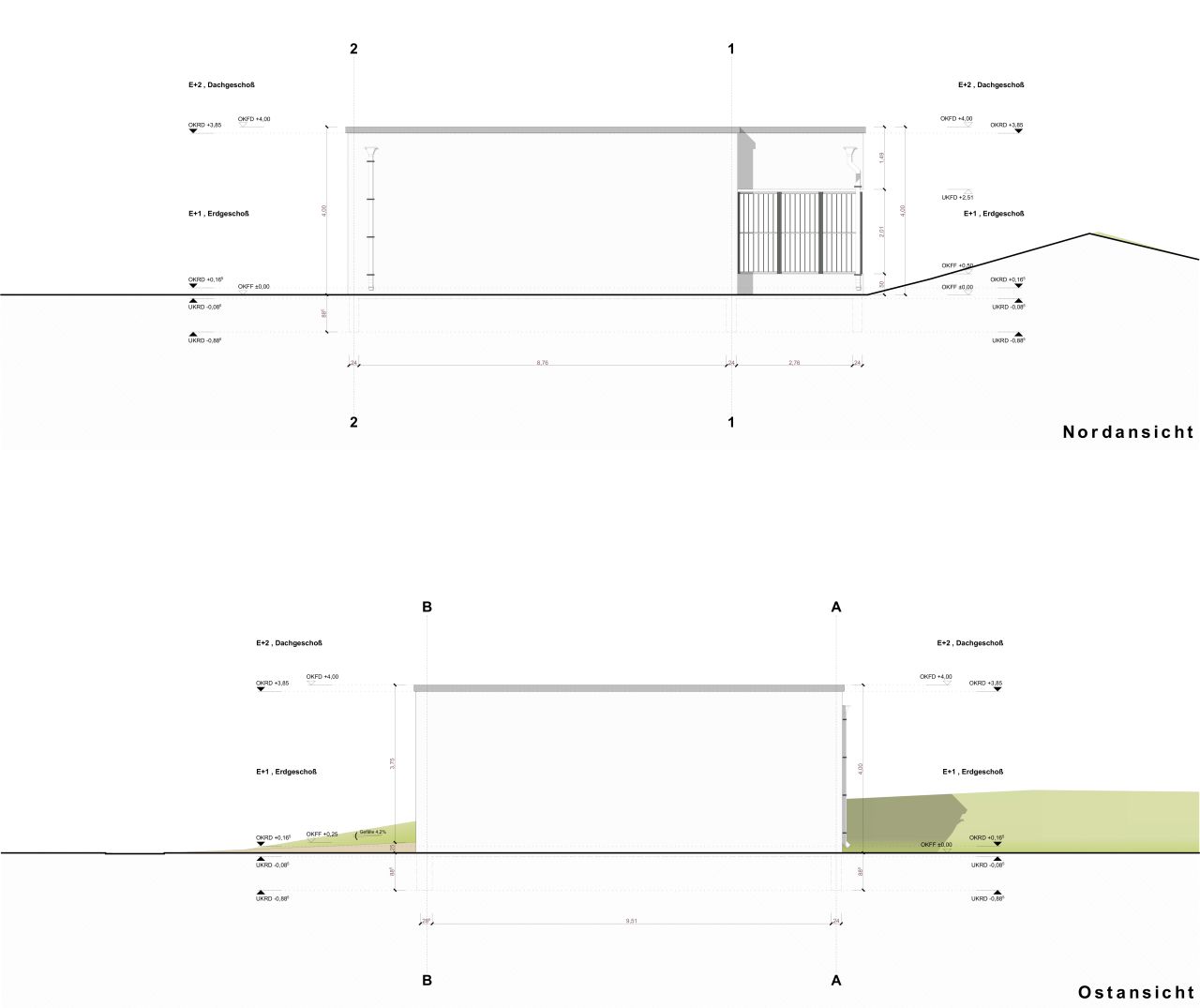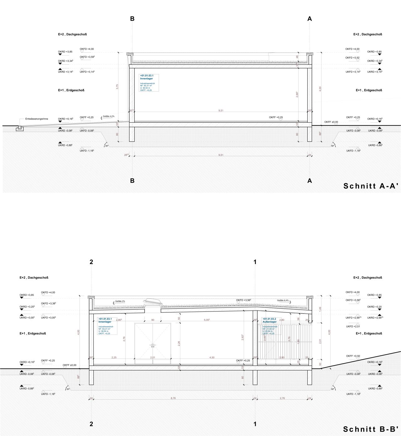 Die Beschreibung bezieht sich auf einen Wohnungsbau mit 63 Einheiten in zwei Gebäuden (A und B) und einer Lagergebäude (Gebäude C) in Berlin-Mitte. Die Gesamtwohnfläche beträgt 4.258,91 m2, während die BGF inkl. Gebäude C 5.903,45 m2 oberhalb des Terrains umfasst. Das städtebauliche Konzept, abgestimmt mit dem Stadtentwicklungsamt, umfasst eine 4-geschossige Bauweise zur Minimierung der Schallemissionen aus dem benachbarten Gewerbegebiet durch eine fensterlose Brandwand an der Nordseite. Dem nördlichen Nachbarn wurde eine mögliche, viergeschossige Grenzbebauung empfohlen, vorbehaltlich einer nachbarrechtlichen Vereinbarung.